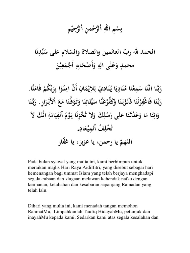 . Pada bulan syawal yang mulia ini kami berhimpun untuk meraikan majlis Hari Raya Aidilfitri yang disebut sebagai hari. 1 Bacaan Doa Majlis Dalam Bahasa Melayu. Doa akhiri mesyuarat 22 20.
